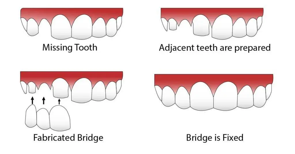Crowns joined together is called as a bridge. It is a custom made appliance used to replace one or multiple missing teeth. The teeth on either side of the missing area are filed down and used as abutments to hold the replacement teeth in its place.
